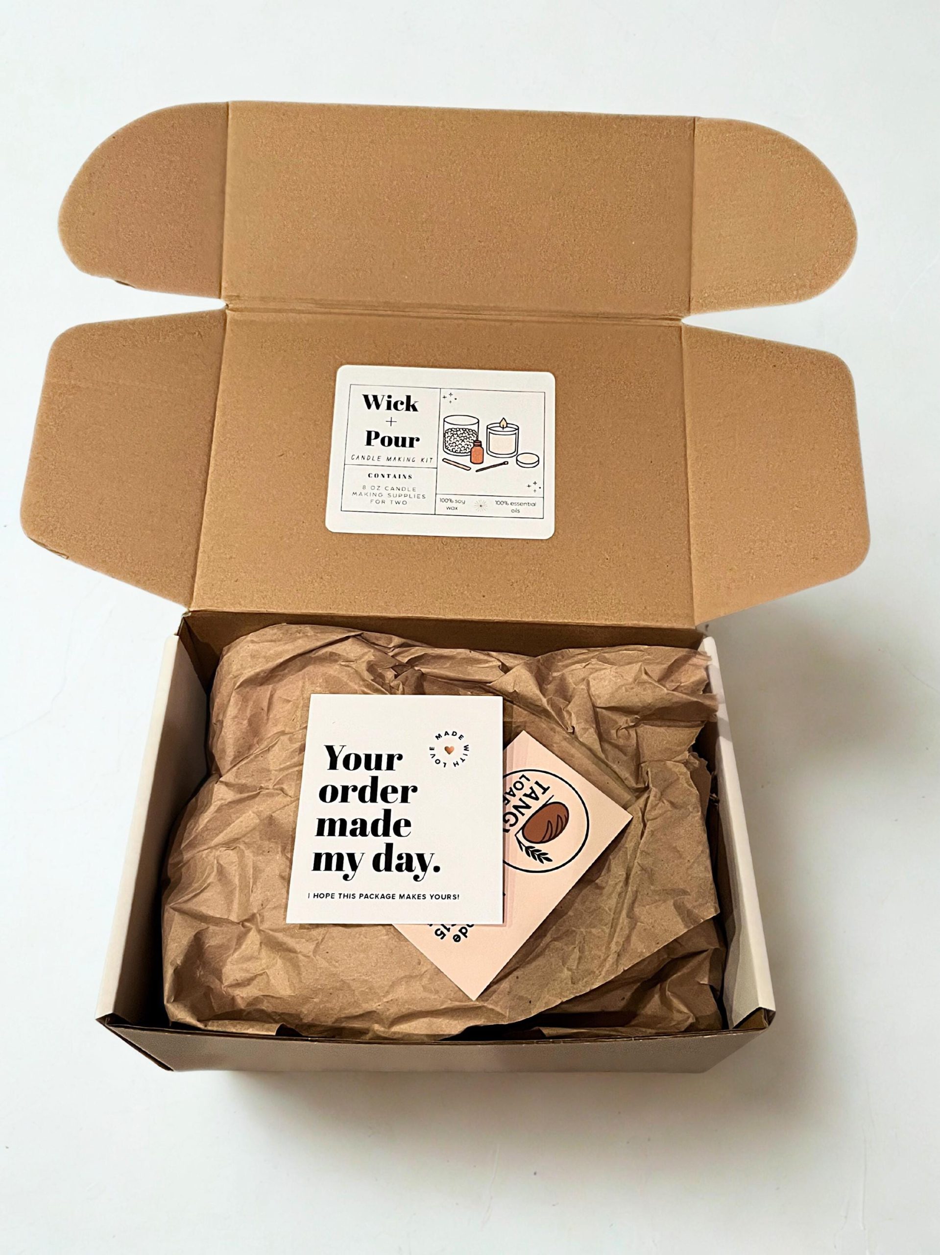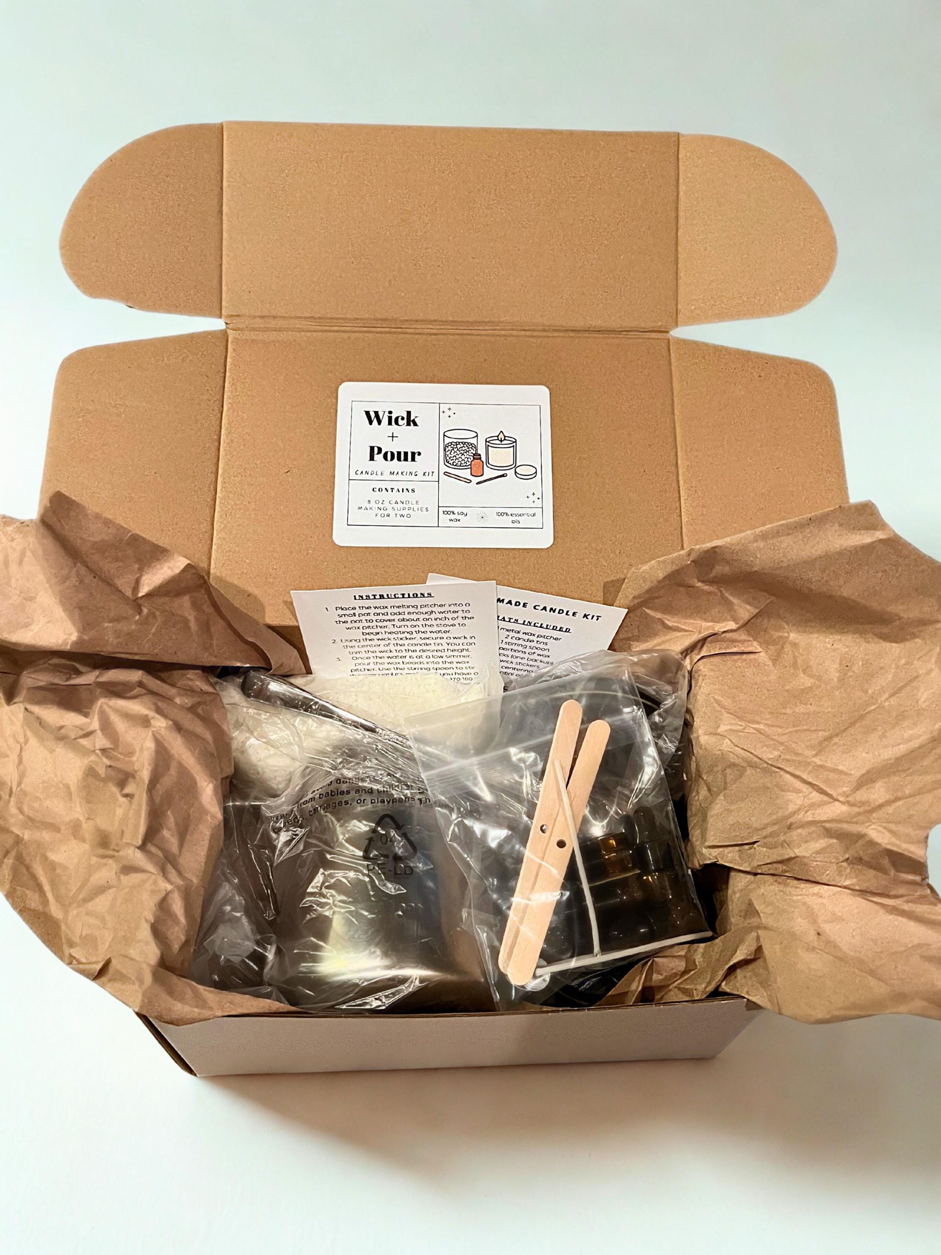 Each kit comes with everything you need to make two natural candles – from melting the wax to blending your favorite scents. A perfect activity for couples, gifts, or self-care nights in.