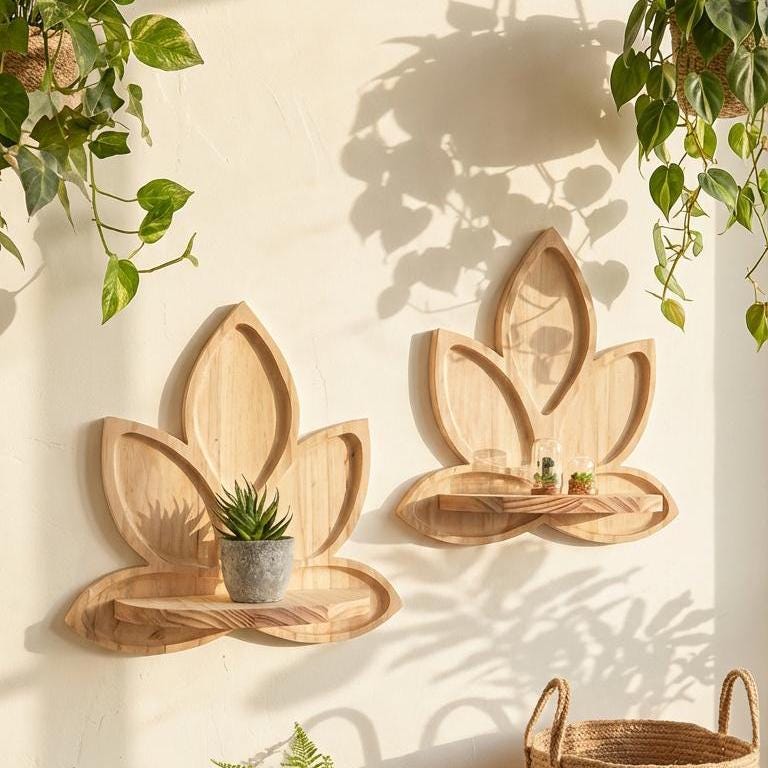 Both decorative and practical, this wooden lotus shelf works beautifully alone or paired in sets for a symmetrical wall display. It’s perfect for plant lovers, mindful living enthusiasts, and anyone seeking a natural, handcrafted touch in their home.