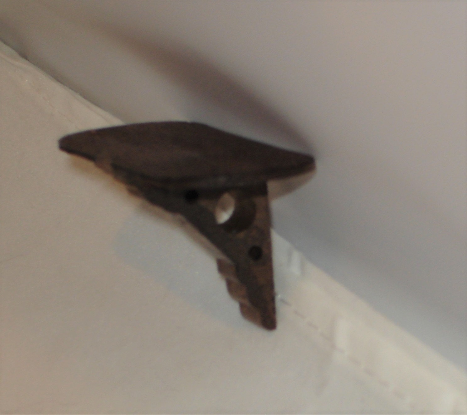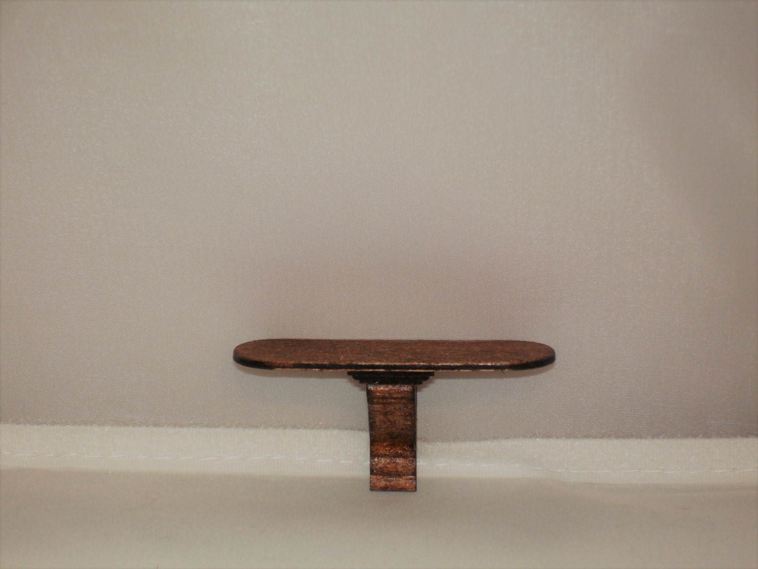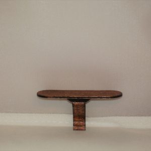 Oval dollhouse shelf, 2 and 5/8″ x 1″, finished with a dark cherry oak stain. Including the brackets, it is 1.25″ tall.