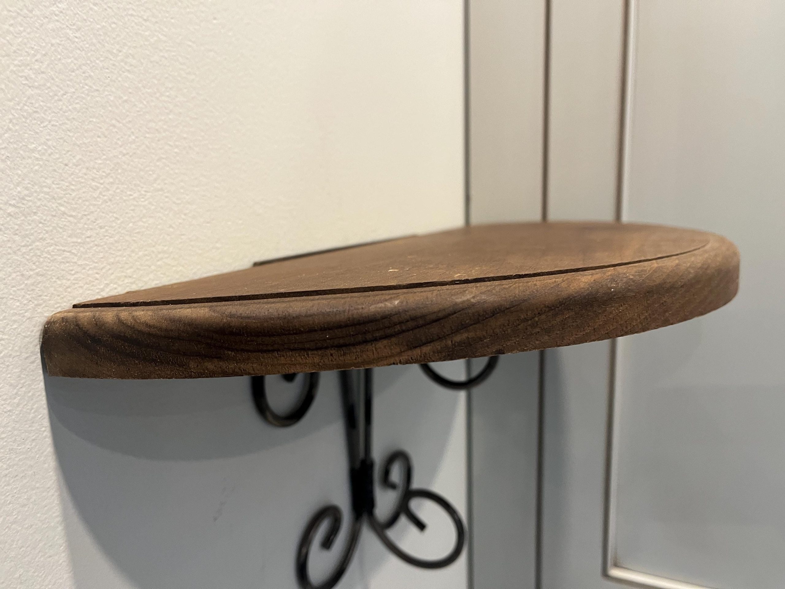 This lovely small wood and wire shelf measures 14 inches wide by 7 inches deep and 7 inches high. The perfect small shelf for a hallway or by the door. Two slots are provided on the back for easy hanging.